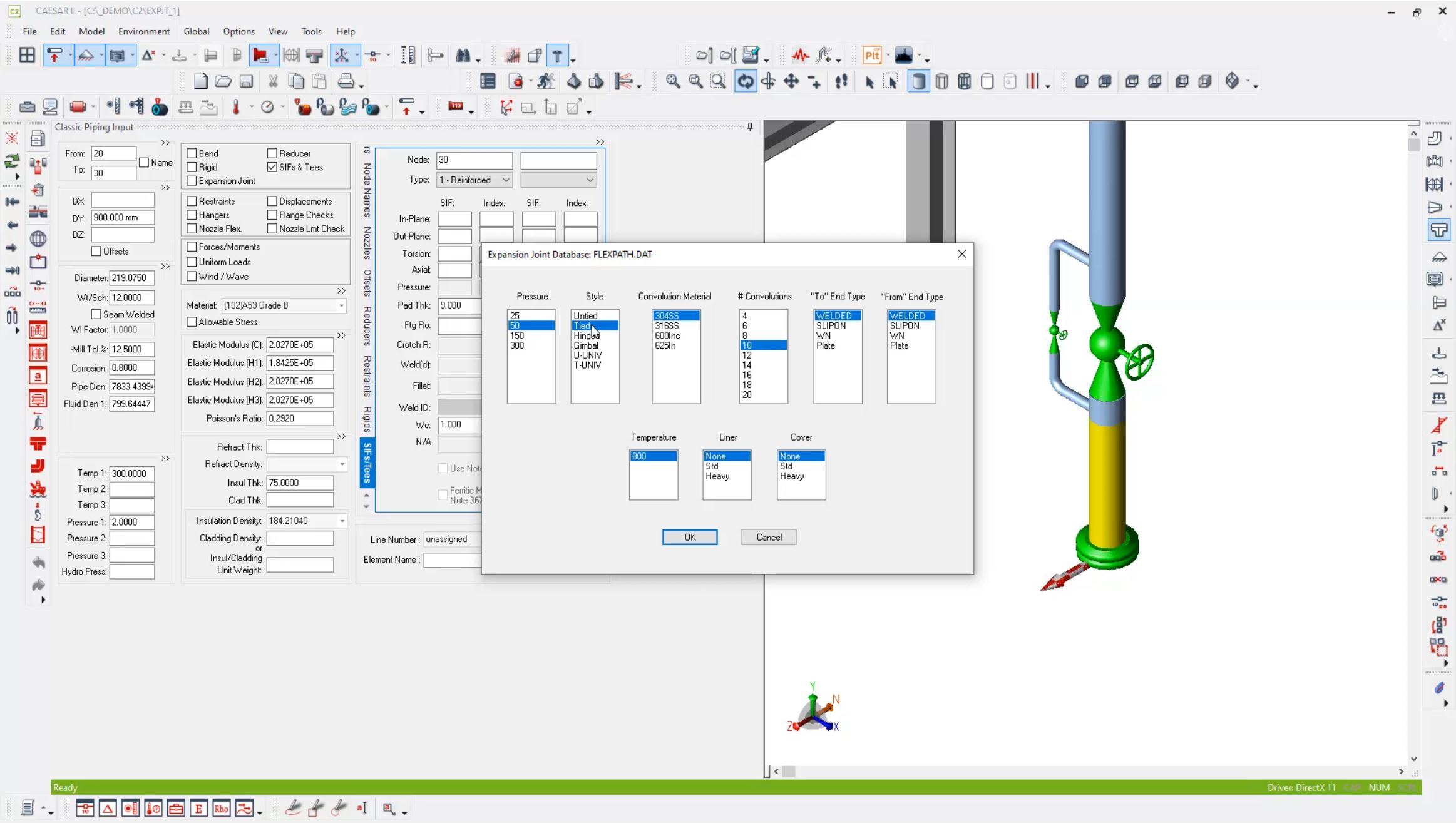 Including an expansion joint in a piping analysis model can be challenging. The user must carefully define not only the joint itself, but also any necessary tie-bars and ensure that everything is connected correctly to allow for the appropriate degrees of freedom. The correct flexibilities of the joint must also be specified from the manufacturer's catalogue. CAESAR II's Expansion Joint Modeller simplifies this process by automatically creating the model with the correct flexibilities and connections, including tie bars.